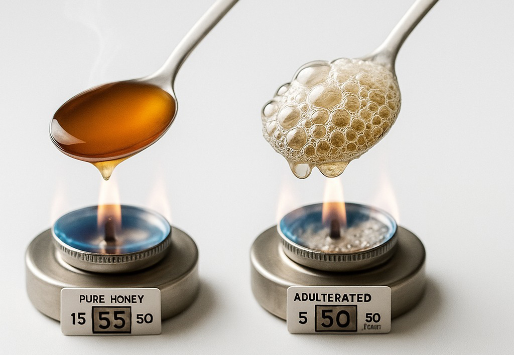 – Mật ong giả, chất lượng kém: Mật ong pha hóa chất, siro công nghiệp hoặc chất tạo màu có thể bắt lửa, phát ra tiếng xèo xèo và tỏa mùi khét khó chịu. Đây không chỉ là dấu hiệu hàng giả mà còn tiềm ẩn nguy cơ ngộ độc nếu dùng lâu dài, do dư lượng phụ gia hoặc tạp chất không rõ nguồn gốc.