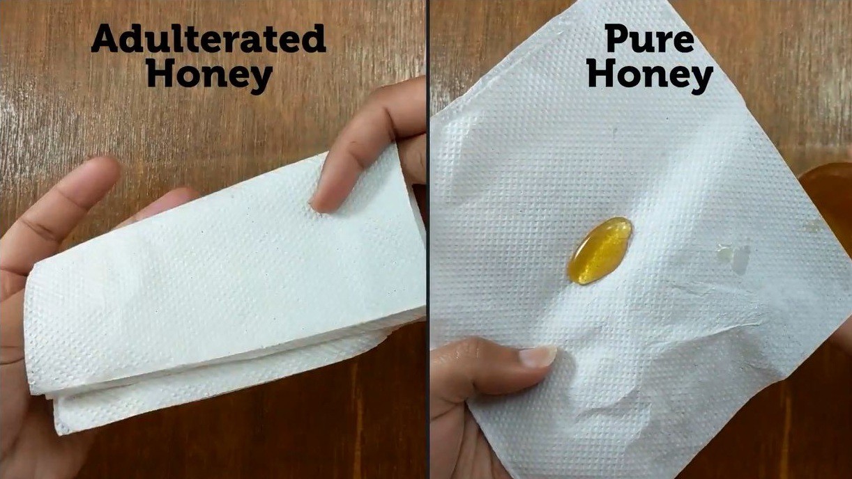 Bạn có thể kiểm tra độ loãng của mật ong ngay tại nhà bằng nước hoặc giấy ăn để đánh giá mật có bị pha nước đường hay không: